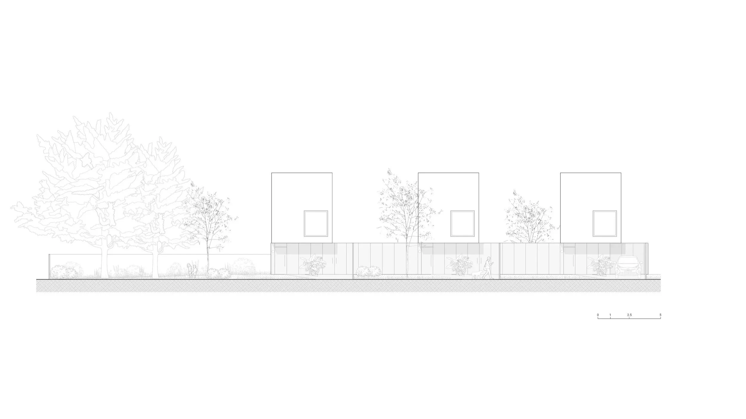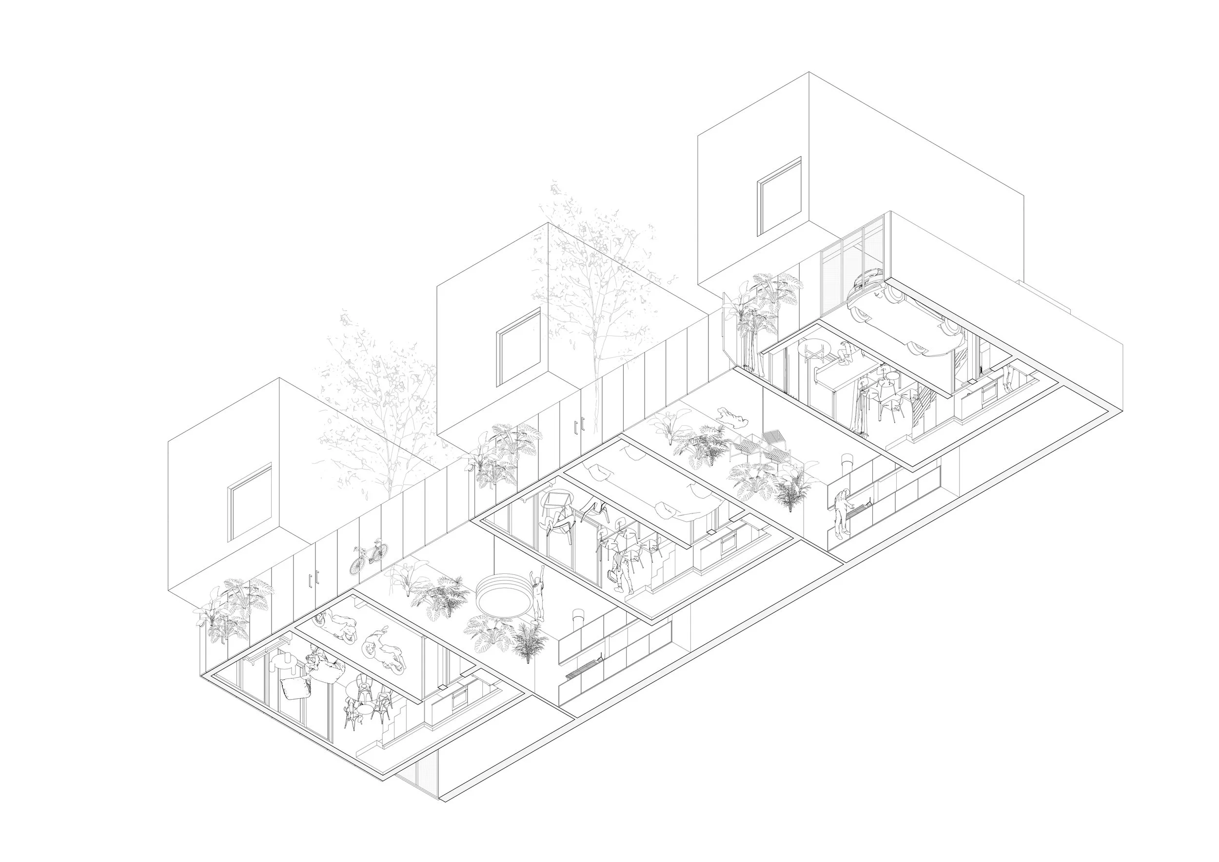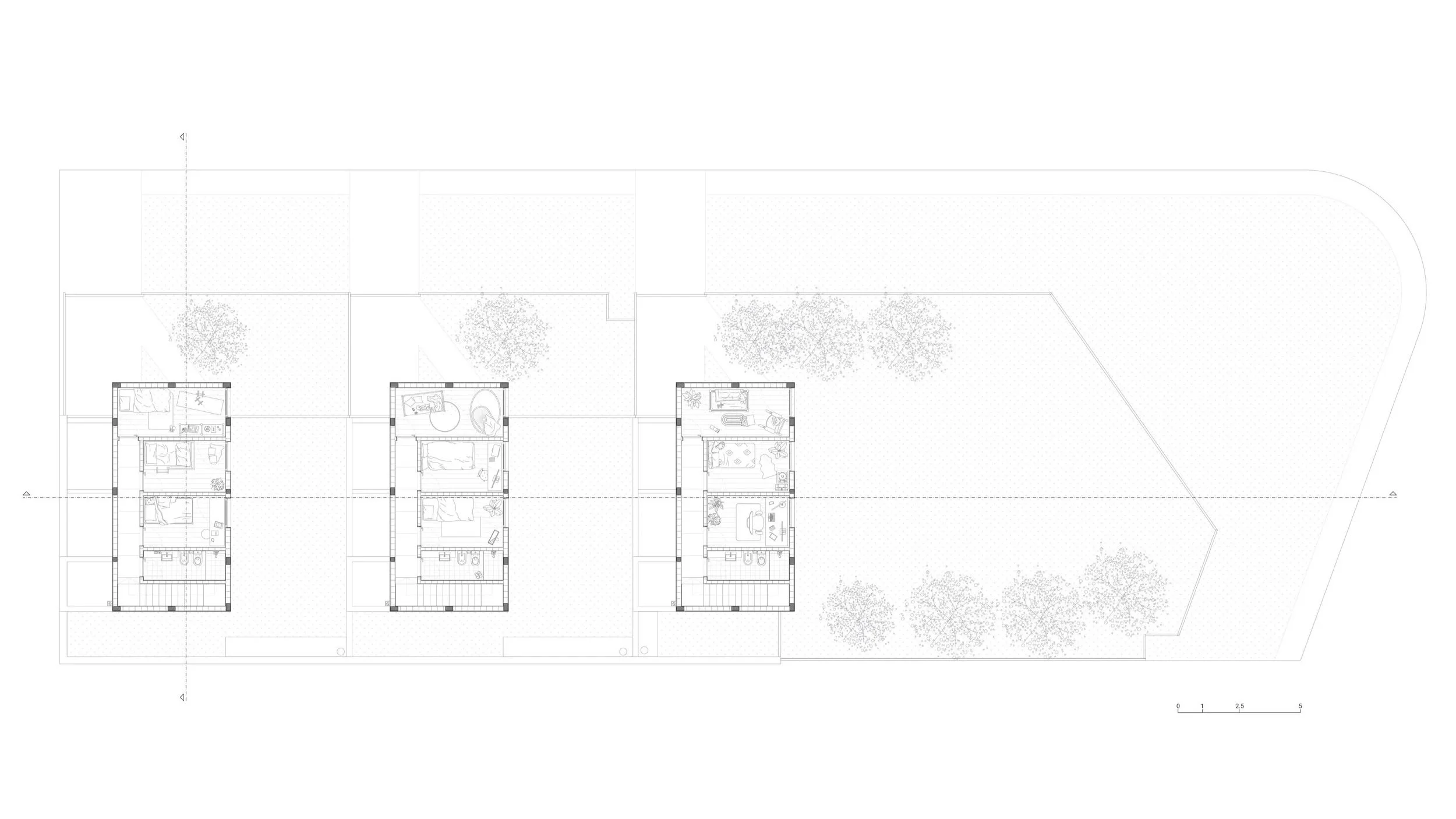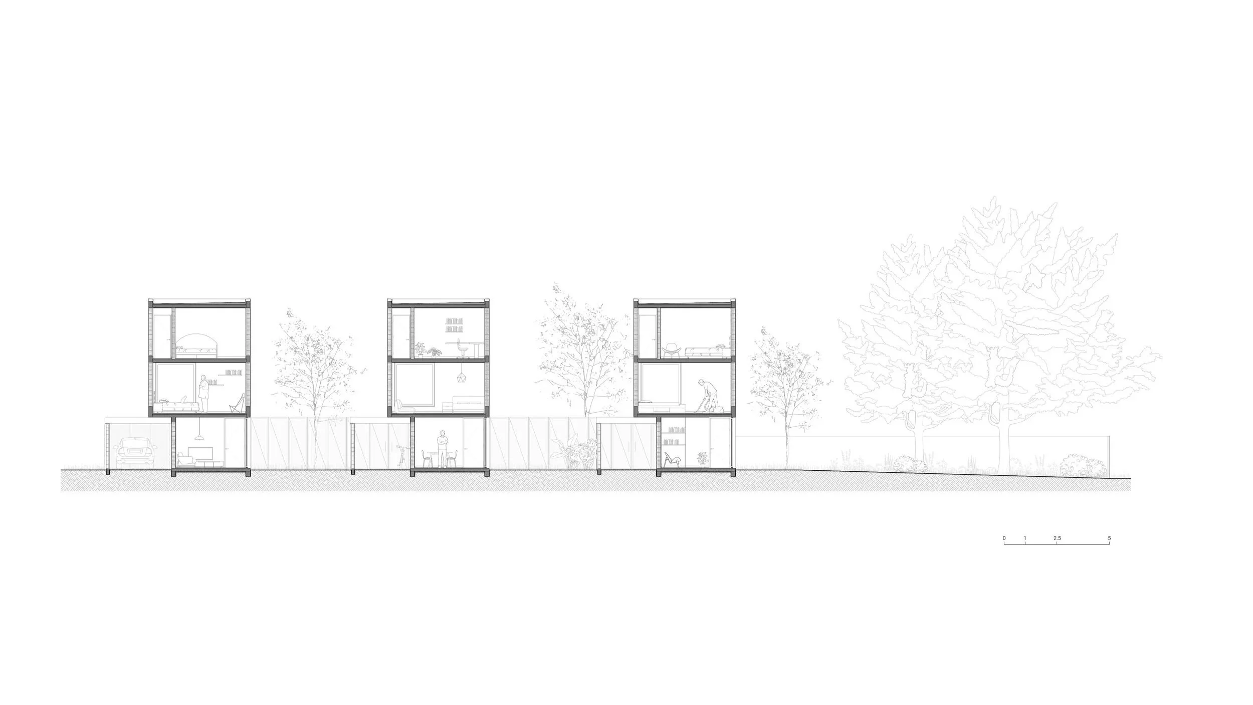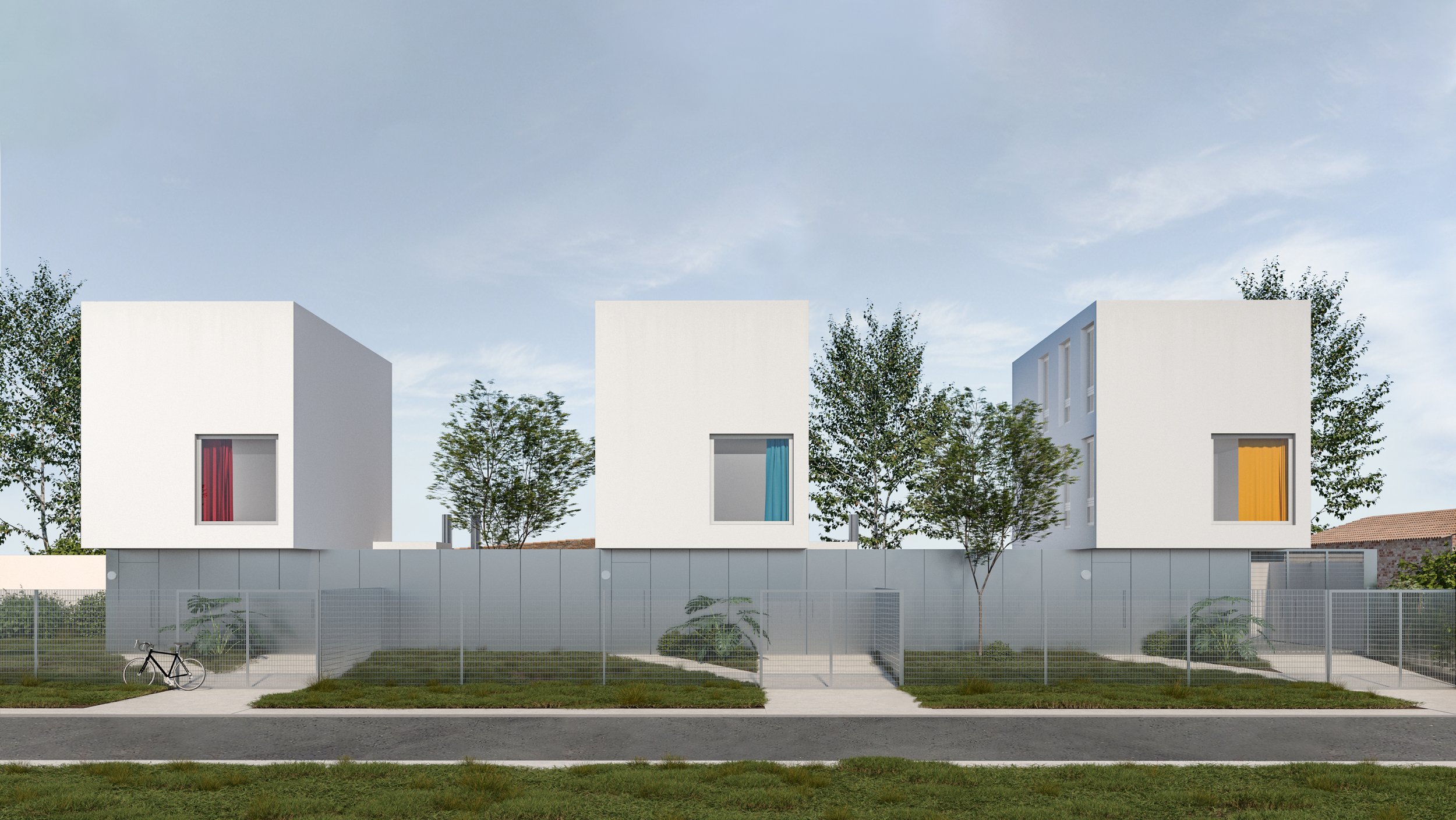 El proyecto es un conjunto de tres viviendas ubicado frente a la rambla de Ciudad de la Costa. Se organiza a partir de una lógica clara, donde los usos públicos y privados se separan verticalmente, ordenando la vida cotidiana.
