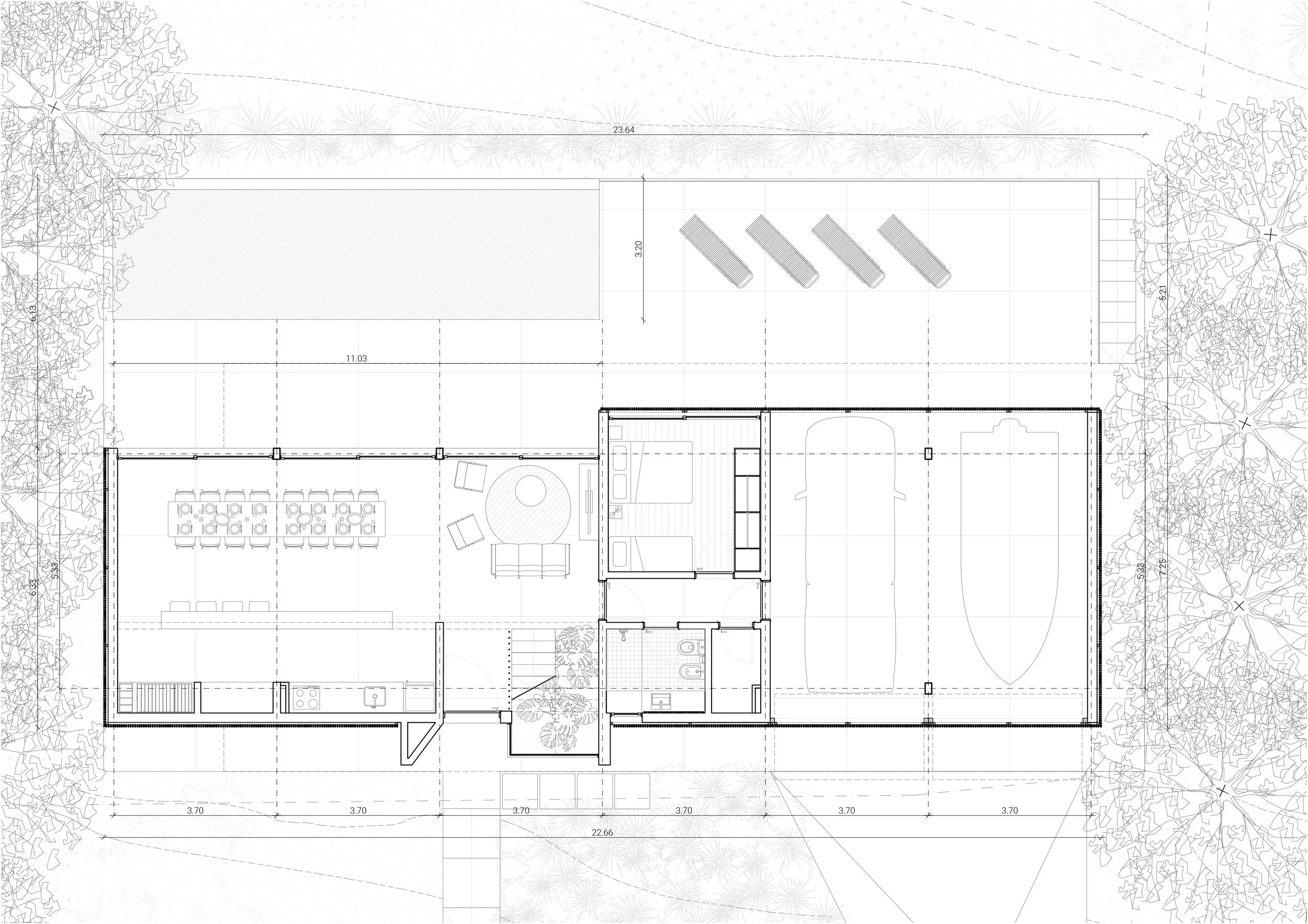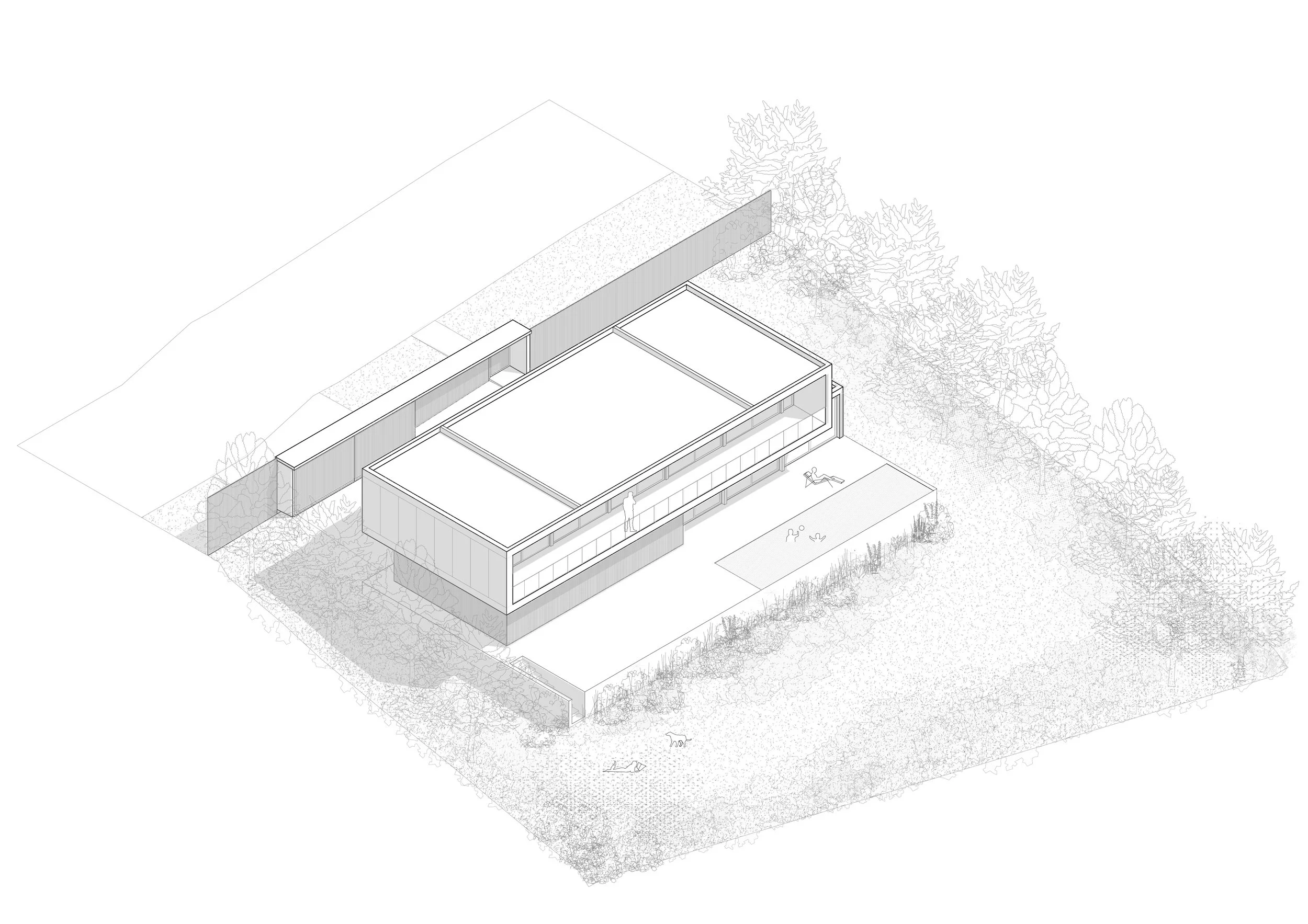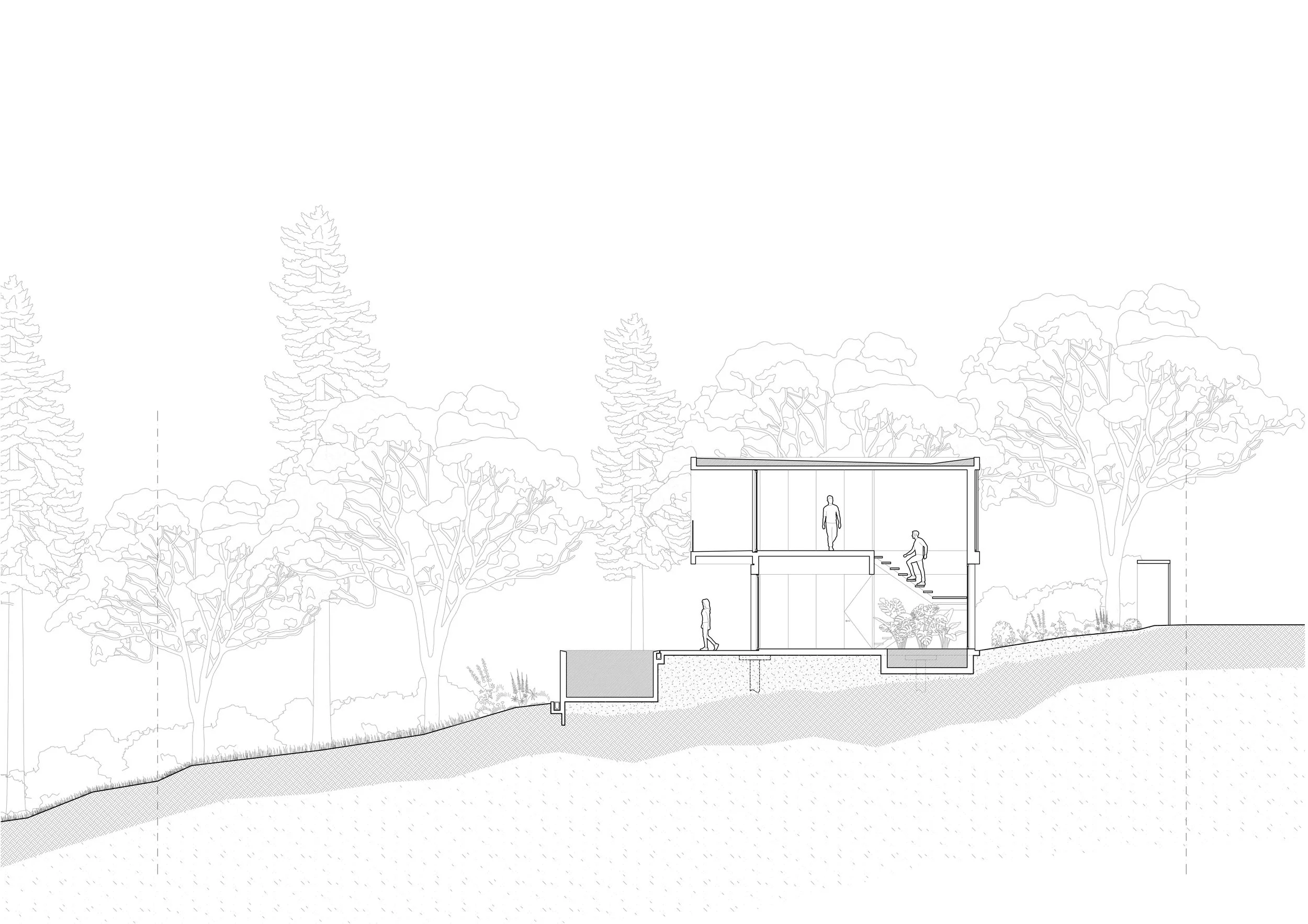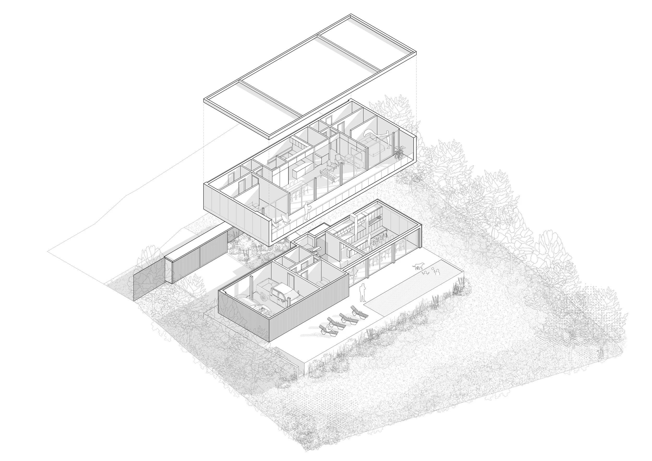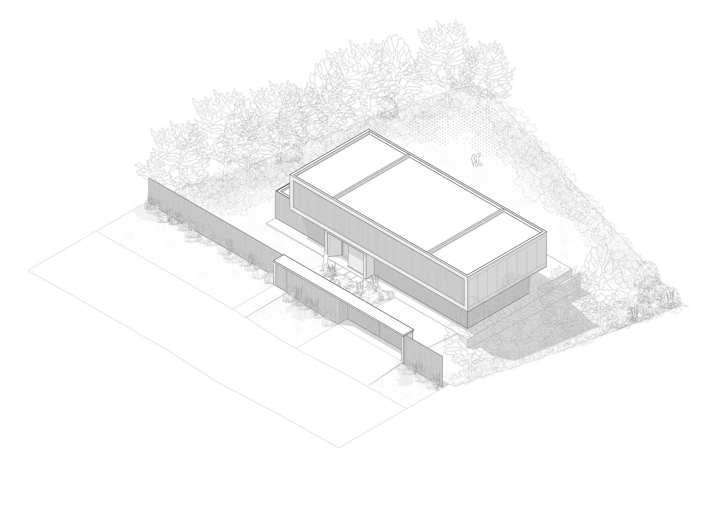 Se despliegan dos planos a modo de terrazas sobre la pendiente: uno, horizontal, prolonga la ladera y conecta la casa al suelo; el otro, elevado, se transforma en punto de observación privilegiado hacia el mar. Habitar aquí no significa aislarse de la naturaleza, sino interactuar con ella, dejar que la casa medie entre el cuerpo y el horizonte. La casa no se limita a ocupar la ladera: la resignifica, se convierte en dispositivo de observación, en mirador habitado donde mar, bosque y cielo se unen con la vida cotidiana.