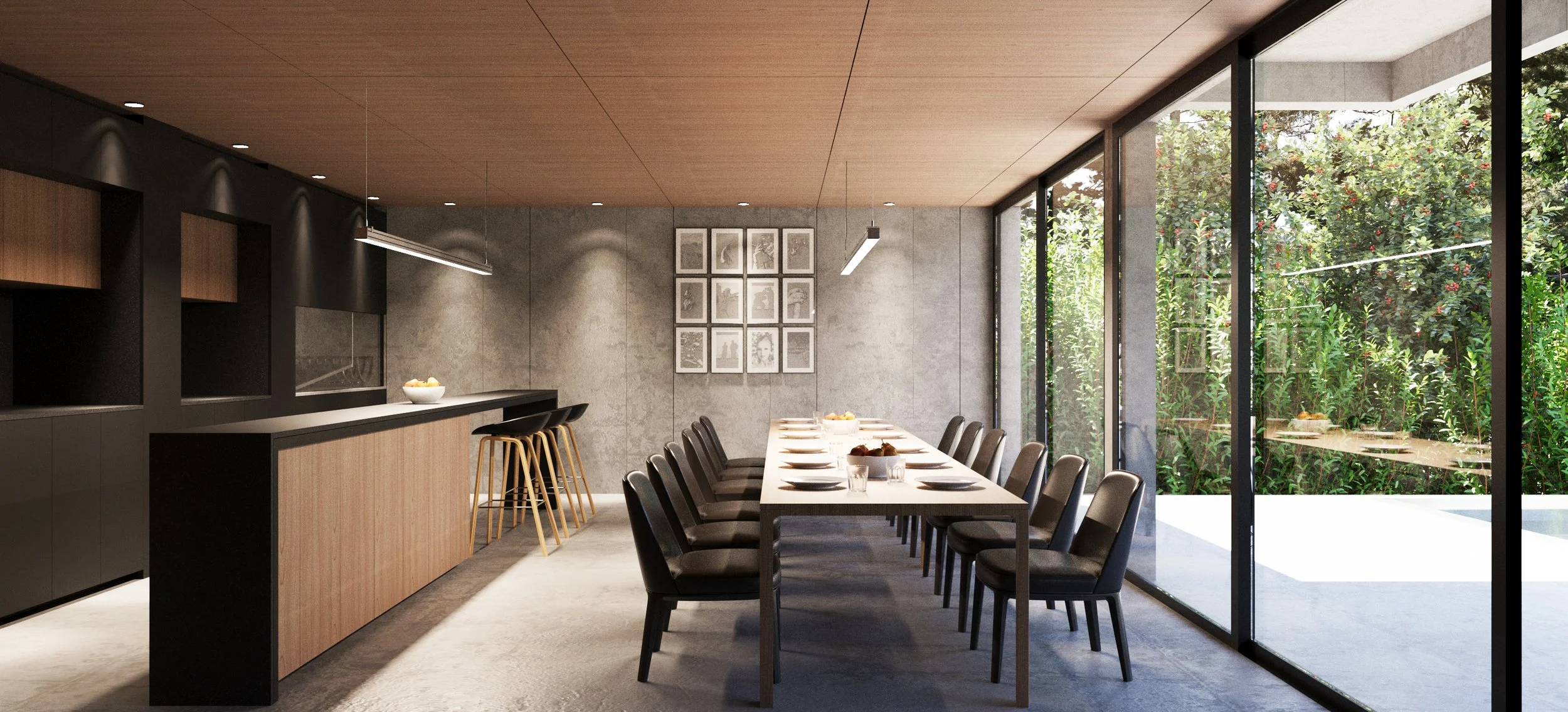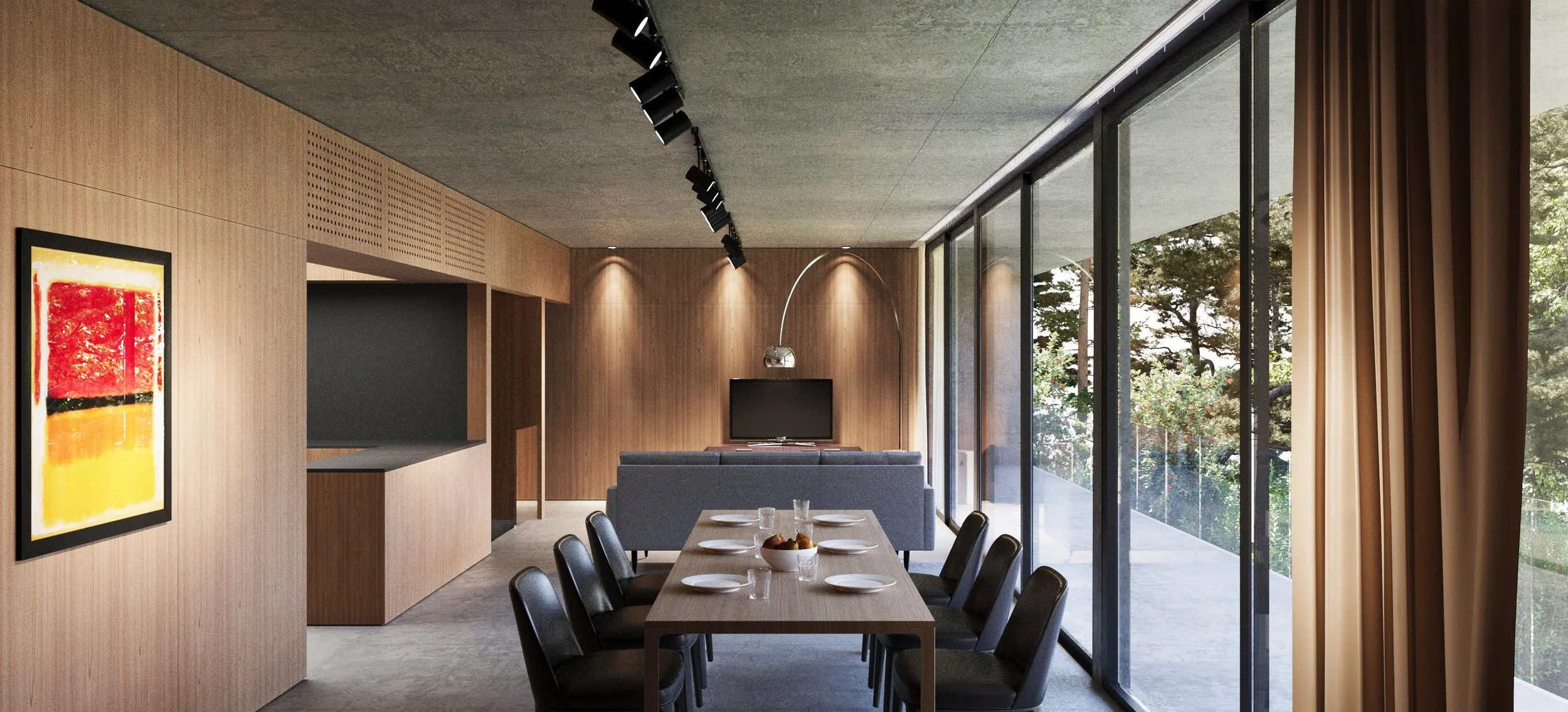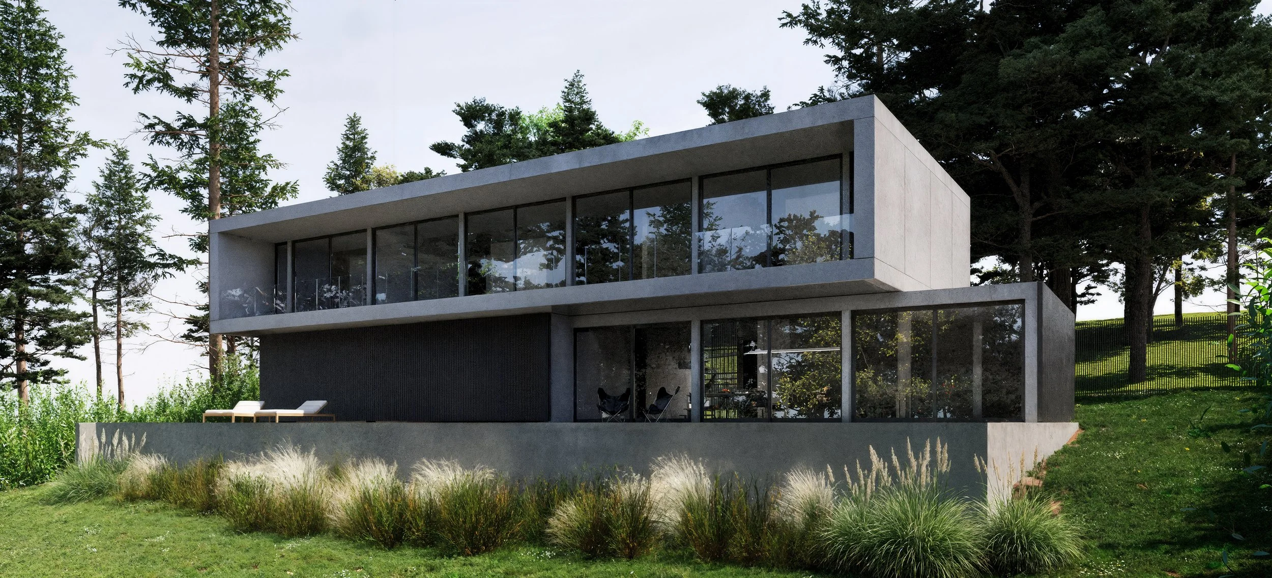Pero hacia la ladera, la condición se invierte. El volumen se abre en grandes superficies vidriadas, terrazas y planos que prolongan la topografía, la casa se convierte en mirador. De este modo, se construye un dispositivo que media entre la intimidad doméstica y la potencia estética del territorio.